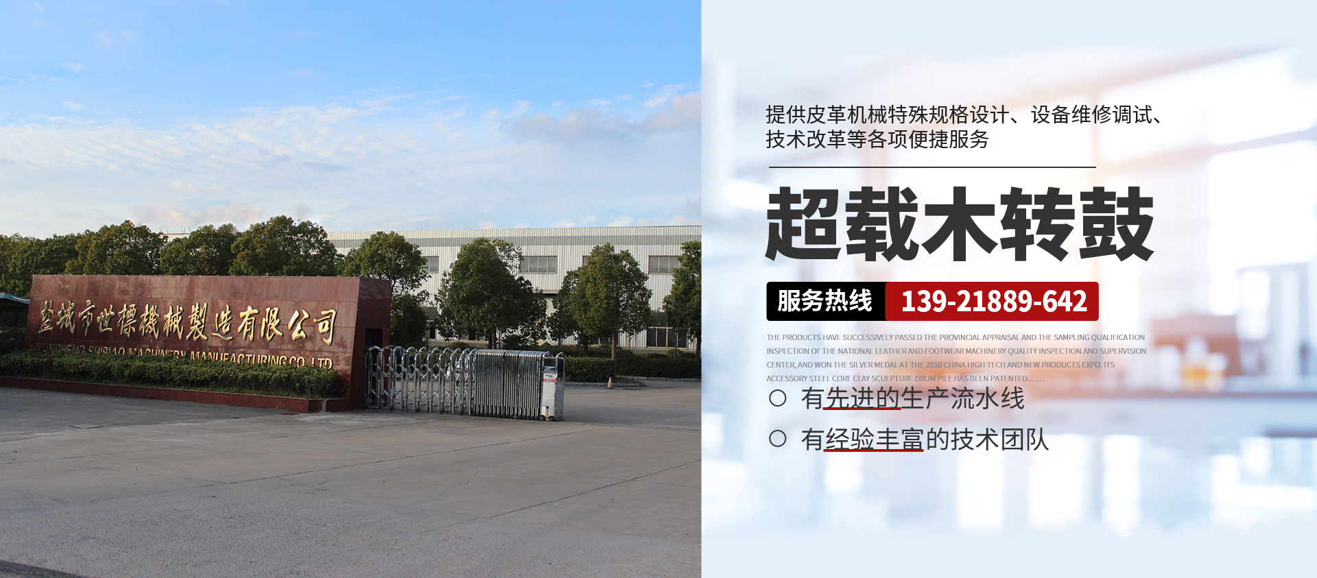 本公司常年提供超載木制轉(zhuǎn)鼓( 意大利/西班牙版本)、GJOB1-2型懸掛式木制轉(zhuǎn)鼓、鐵制轉(zhuǎn)鼓、Y型不銹鋼全自動(dòng)分格鼓、全自動(dòng)不銹鋼圓形、八角形摔軟轉(zhuǎn)鼓、PP染色等多功能轉(zhuǎn)鼓、HC系列劃槽、不銹鋼試驗(yàn)轉(zhuǎn)鼓等皮革機(jī)械產(chǎn)品,產(chǎn)品暢銷(xiāo)浙江、山東、廣東、福建、河南、河北、四川、新疆、遼寧等地,且遠(yuǎn)銷(xiāo)非洲、東南亞、南美洲、中美洲等多國(guó),深受各大制革廠家的青睞。產(chǎn)品相繼通過(guò)省級(jí)鑒定和全國(guó)皮革、制鞋機(jī)械質(zhì)量檢測(cè)監(jiān)督中心的抽樣合格檢驗(yàn),在2010中國(guó)高新技術(shù)、新產(chǎn)品博覽會(huì)上一舉榮登銀獎(jiǎng)寶座,其配件鋼芯泥塑鼓樁獲 專(zhuān)利權(quán)。本公司并向客戶提供皮革機(jī)械特殊規(guī)格設(shè)計(jì)、設(shè)備維修調(diào)試、技術(shù)改革等各項(xiàng)便捷服務(wù),具有健全的檢測(cè)體系和可靠的售后服務(wù)。